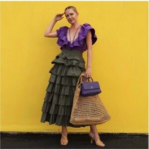 Deep V plunging neck and back line, oversized ruffles for extra flare, high bikini cut, all wrap up in PURPLE 🤩