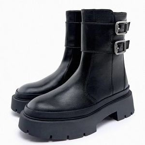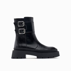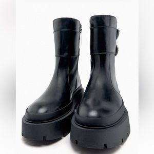 Zara Low Heeled Buckled Leather Ankle Boots in Black Sz 37 / 6.5