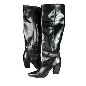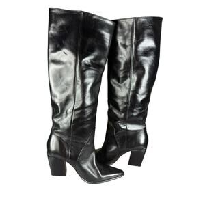 ZARA Leather Knee High Pull-On Boots Black Block Heel Made in Spain 6.5