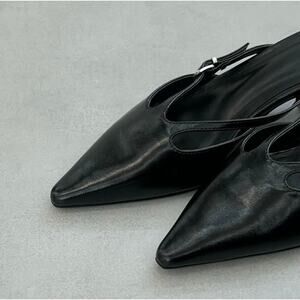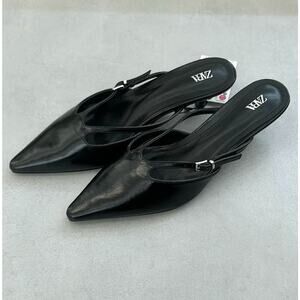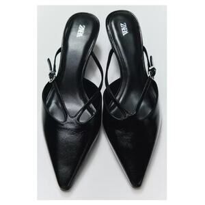 Black heeled leather slide shoes. Strap details with buckle at front. Kitten heels. Pointed toe. From ZARA, in US size 7.5 (EUR 38). New with tags. Sold out in stores.