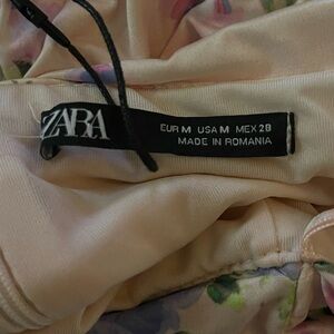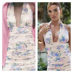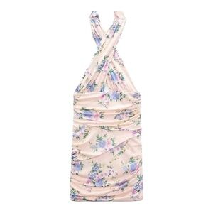 ZARA Light Pink Floral Halter Neck Open Back Ruched Bodycon Mini Dress Medium