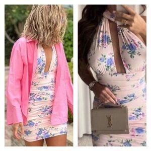 NEW without tags ZARA Blogger Favorite Light Pink Floral Deep V Neck Halter Bodycon Mini Cocktail Dress Valentines Day