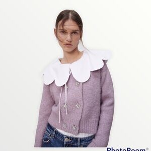 ZARA Fuzzy Lilac Lavender Purple Rhinestone Button Front Preppy Sweater