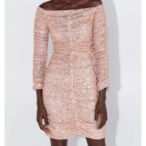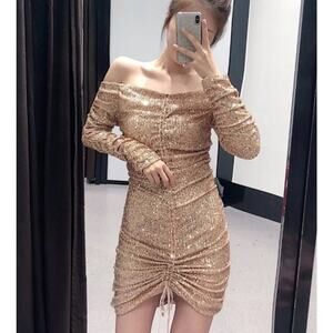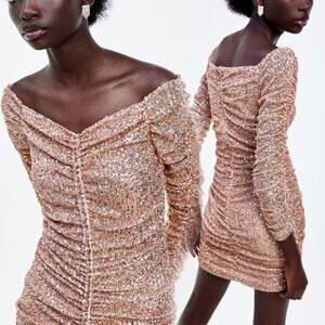 ZARA Limited Edition Draped Sequin Mini Dress Off The Shoulder Long Sleeve