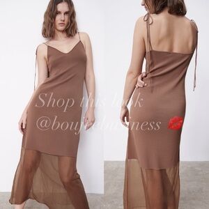 Knit V-neck with adjustable tie thin straps. Tonal matching fabric skirt.