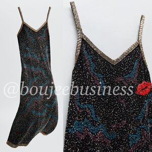 V-neck knit slip dress. Contrasting Sequin and bead Appliqués.