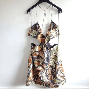ZARA Linen Blend Camo Lined Cut out Dress size Medium Palm Leaf Print