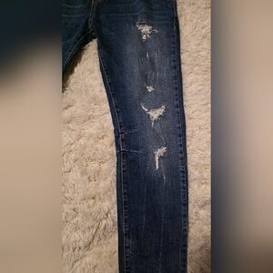 Stylish men's denim bib overalls perfect for casual outings. Features a classic blue color and distressing to add style. Sz. Large 29 in. inseam