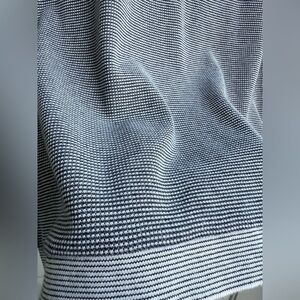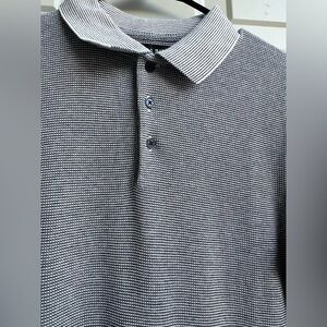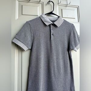 Gently used ZARA MAN short sleeve polo shirt in size S. Features a navy and white microstripe pattern, three-button placket, and contrast trim on the collar, sleeves, and hem.