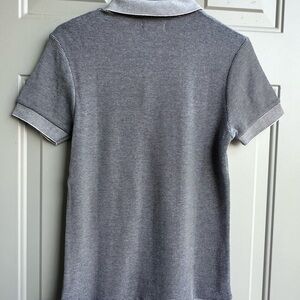 Gently used ZARA MAN short sleeve polo shirt in size S. Features a navy and white microstripe pattern, three-button placket, and contrast trim on the collar, sleeves, and hem.