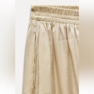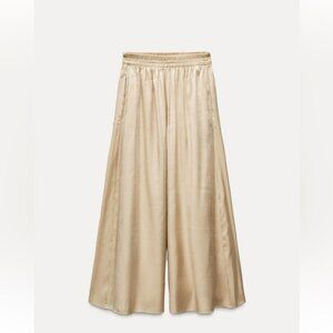 High waist pants with an elastic waistband. Side hidden in-seam pockets. Maxi wide leg.