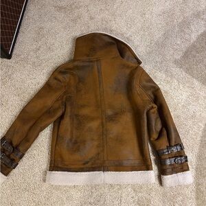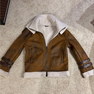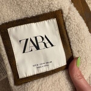 Embrace a rugged, vintage-inspired look with this Zara military field jacket, featuring a rich brown exterior and a plush cream lining. The wide collar and distressed finish add to its timeless appeal, ensuring warmth and style in any setting.