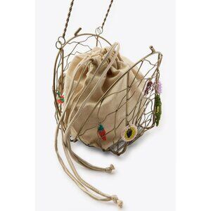 Rigid metal bag with pendants of different charms. Adjustable inner lining with satin ties.