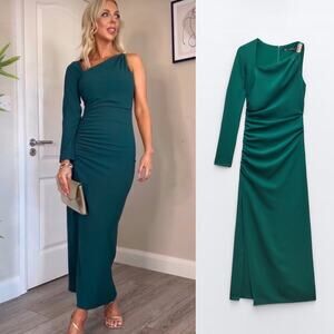 Midi dress with asymmetric neckline. One long sleeve and one strap with metal piece. Ruched fabric. Side slit at hem. Back hidden in-seam zip closure.