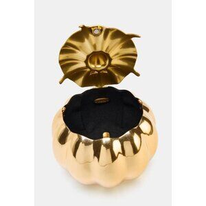Rigid pumpkin-shaped bag. Metallic effect. Crossbody chain strap. Interior lining. Magnetic button closure.