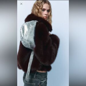 Metallic shoulder bag. Shoulder strap with knotted ends and fringing on one side. Interior zip pocket and zip fastening.