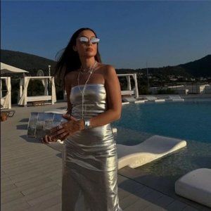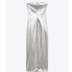 Strapless midi dress with straight neckline. Metallic fabric. Ruching detail.