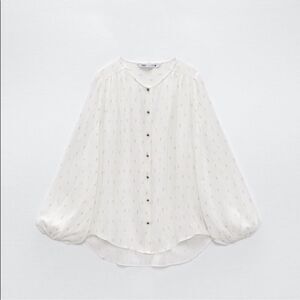 Metallic thread appliqué detail. Asymmetric hem. Front button closure.