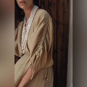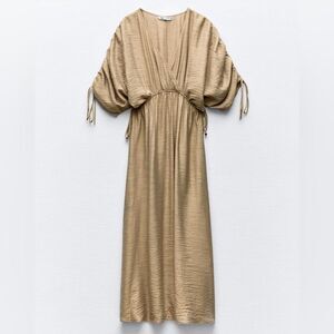 Surplice V-neck dress with gathered ample short sleeves adjustable with ties. Elastic waistband with side bows. Side vents at hem.