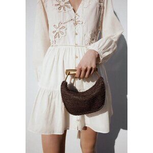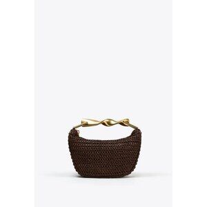 Mini braided bag with a braided top. Metallic gold top handle and double adjustable and detachable crossbody strap. Lining and inside pocket. Zip closure.