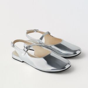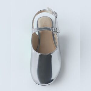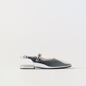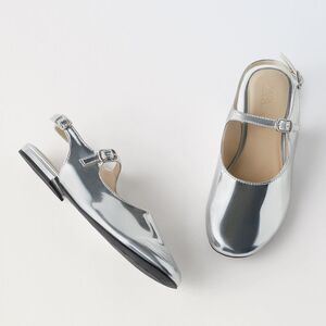 Flat slingback shoes with mirrored finish. Adjustable back buckle closure.