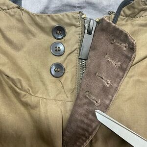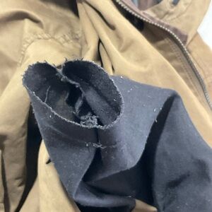 This is a Zara hooded jacket for women in brown, size Xtra Large, with long sleeves and a drawstrings. Note this jacket has 2 small condition issues; 1, a small button is missing at the top of the coat the 4th of 4 button at the top of the coat. 2, a tear inside the pocket. Please see pictures for more detail on both issues