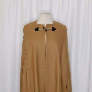 Rounded neckline ~ Large toggle rope closure on the front just under the neckline ~ Open slits on the sides for the arm to come through ~ Two inset pockets on the front ~ Fully lined ~ Swingy A-line silhouette ~ Exterior/Shell fabric is a wool blend with a texture to the fabric ~ Lining is a solid black … exterior shell is a brown camel color