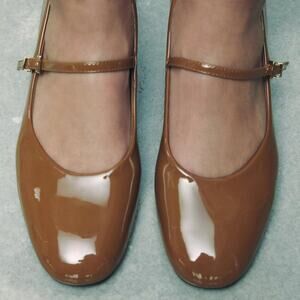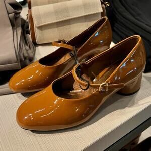 Step into timeless elegance with these ochre patent Mary Jane heels, featuring a front strap with buckle, rounded toe, and low block heel for a chic, vintage-inspired silhouette. The glossy finish and minimalist design make them versatile enough for both workwear and weekend looks.