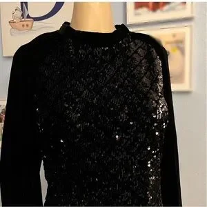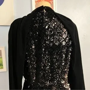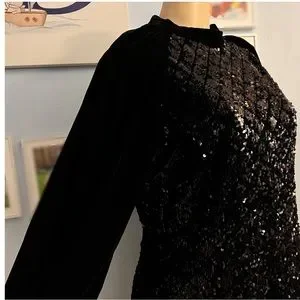 Velvet mini dress whit high collar and long balloon sleeves matching sequin appliqué. Back hidden zipper and button closure.