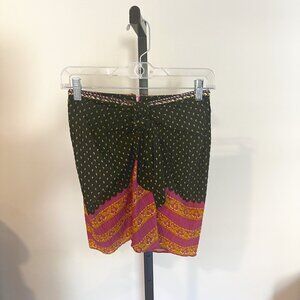 This bold, lightweight mini skirt from ZARA is a standout piece featuring a unique mixed print design: a black and yellow paisley top section contrasted with vibrant magenta and orange floral stripes. Finished with a front tie knot and smocked texture, it's the perfect piece to add a pop of personality to your summer or festival wardrobe.
