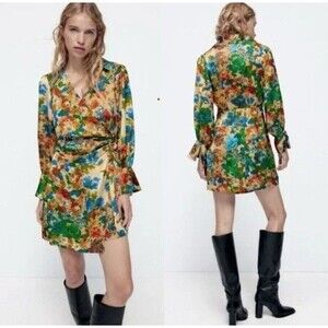 ZARA Moody Floral Bell Sleeve Satin Effect Wrap Mini Dress Size XS