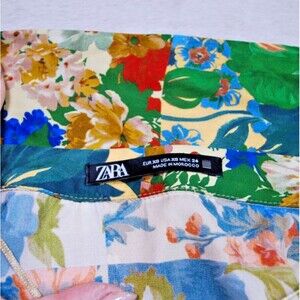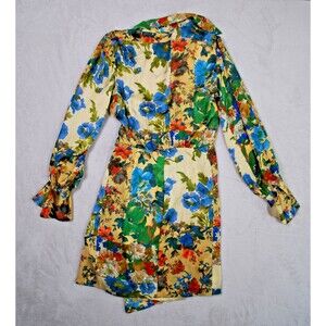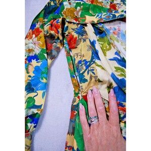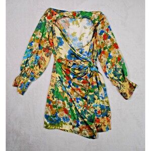 The ZARA Moody Floral Bell Sleeve Satin Effect Wrap Mini Dress in size XS is a stylish and versatile piece suitable for both party/cocktail and casual occasions. The dress features a beautiful floral pattern, long bell sleeves, and a V-neckline, adding a touch of elegance to the short silhouette. Made from polyester satin, the dress has a side zip and front tie waist closure, making it easy to wear and adjust. The multicolor design and Moroccan craftsmanship give it a unique and trendy appeal, perfect for the summer, fall, and spring seasons.