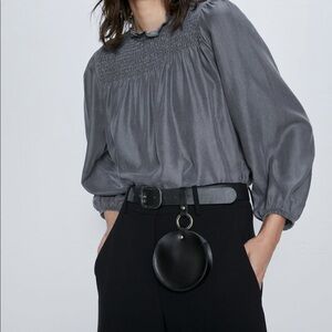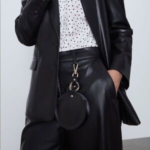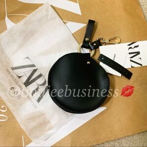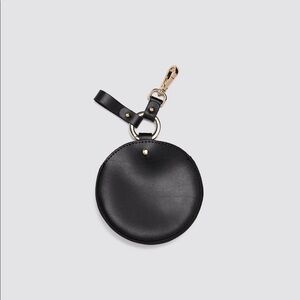 Round leather coin purse with removable metal carabiner and snap strap. Snap closure