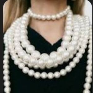 Multi-length necklace with faux pearl appliqué. Lobster clasp closure.