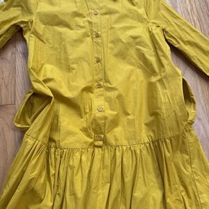 Chic and effortless, this ZARA mustard yellow midi dress is a standout piece for any season. Crafted from soft poplin-style fabric with a crisp, structured feel, it features a button-front design that stops mid-torso, a collared neckline, and a flowy gathered skirt for a feminine silhouette. Side pockets add both charm and practicality.