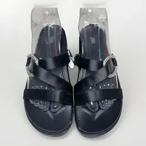 ZARA *NEW* Black Satin Rhinestone Slides Slip On Flat Sandals Women EU 39 US 8