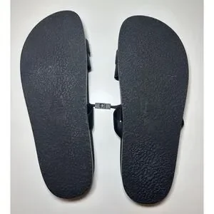 * These slip-on flat sandals feature a solid black color with rhinestone accents, adding a touch of glamour to any outfit.