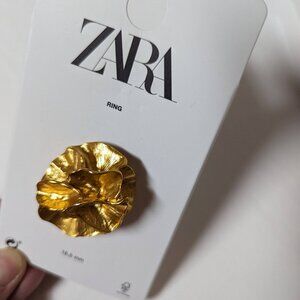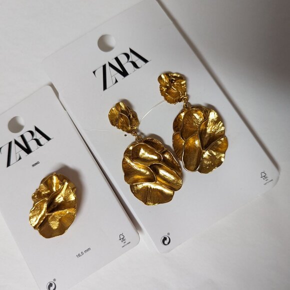 ZARA NEW Flower PETAL DROP EARRINGS AND Ring set GOLDEN