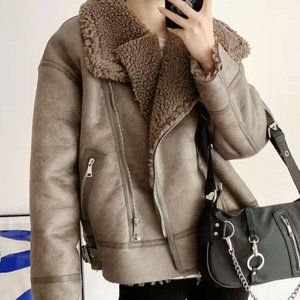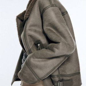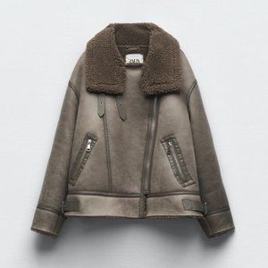 ZARA NEW WOMEN FAUX LEATHER SHEARLING DOUBLE-FACED BIKER JACKET GRAY 3548/243 XL