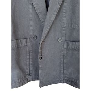 Blue sport coat/work jacket hybrid from ZARA is a men's size medium. Boxy shape with no vents, this jacket sports square outside pockets instead of the traditional slash cut. Two buttons (for buttoning on either side). Material is a heavy cotton, almost like a denim.