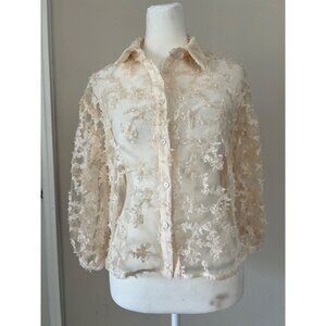 ZARA NWOT womens ivory mesh floral pattern button down blouse XL