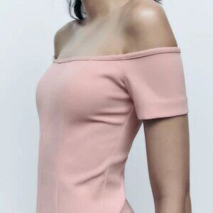 ZARA Baby Light Pink Topstitched Off the Shoulder Bodycon Midi Dress