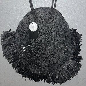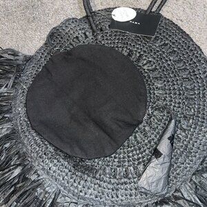 ZARA NWT Black Handmade Raffia Round Bag with Fringe & Attached Interior Purse