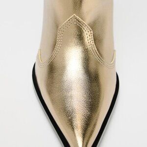 Thin heel knee high boots. Metallic effect. Tall shaft. Topstitching detail at exterior. Side pull tabs. Pointed toe.