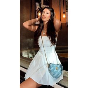 Short dress with straight neckline and straps. Pleats on the chest and waist. Matching lining. Invisible back zip fastening.