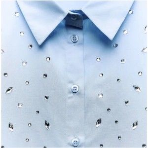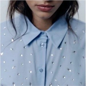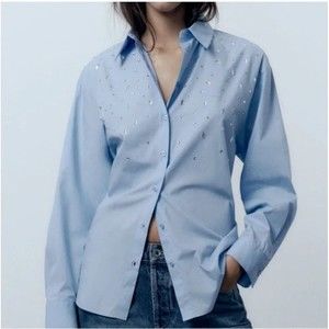 Elevate your wardrobe with this stunning Zara shirt top in a beautiful blue hue. The shirt features intricate rhinestone accents, adding a touch of elegance to your outfit. The collared neckline and button closure make it perfect for both casual and business occasions.