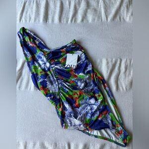 ZARA NWT Women's Blue Multi Floral Asymmetrical One Shoulder Bodysuit Size Med
