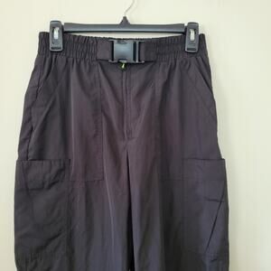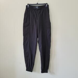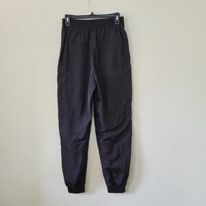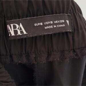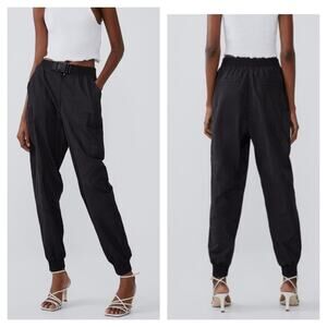 ZARA NYLON JOGGING PANTS BLACK - 4391/251 High-waisted water repellent pants with elastic waistband. Patch pockets at the side and leg and false back welt pockets. Elastic cuff hems. Front zipper and clip closure.