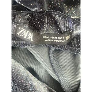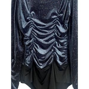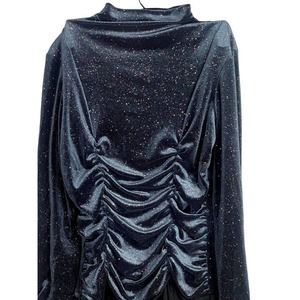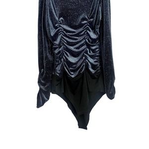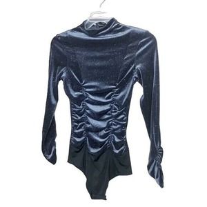 ZARA Navy Blue Ruched Velvet Glitter Mock Neck Long-sleeve Bodysuit