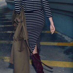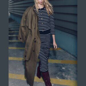 Elevate your wardrobe with this ZARA navy blue and white striped knit pencil skirt, a classic, sophisticated, and figure-flattering essential that seamlessly blends style and comfort. The Perfect Balance of Chic & Effortless Style Crafted with a soft, breathable knit fabric, this high-waisted, body-hugging midi skirt is designed to enhance your silhouette while offering a flexible, comfortable fit. The bold horizontal stripes add a modern yet timeless touch, making it a must-have for the fashion-forward woman who loves to effortlessly transition from work to weekend.